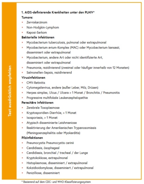 - „Late diagnosis“ bedeutet, dass die CD4-Zellzahl bei Diagnose unter dem Wert von 350 Zellen/µl liegt oder bereits AIDS-definierende Erkrankungen vorliegen, bzw. innerhalb von 3 Monaten nach positivem Ersttest auftreten.