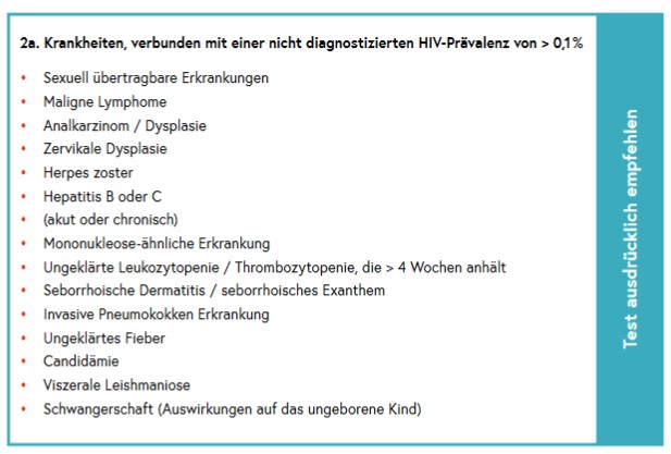 Einige Erkrankungen stehen nicht in Zusammenhang mit einem fortgeschrittenen Immundefekt, sind jedoch mit einer statistisch erhöhten Wahrscheinlichkeit für eine undiagnostizierte HIV-Infektion verbunden. Das Angebot eines HIV-Tests ist daher sinnvoll. Hierzu zählen etwa alle anderen sexuell übertragbaren Infektionen.