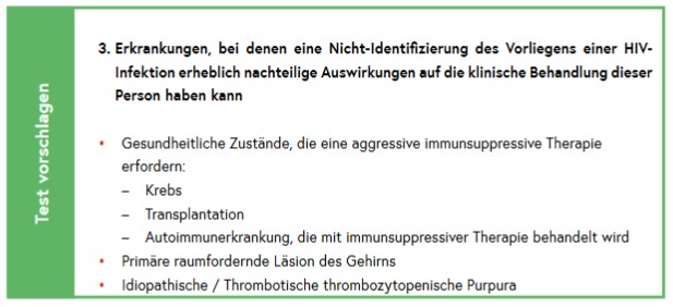 Manche Erkrankungen sind nicht mit einer HIV-Infektion assoziiert, allerdings würden sich bei Vorliegen einer untherapierten HIV-Infektion deutliche Nachteile in der Behandlung ergeben. Hierzu gehören alle Konditionen, die eine immunsuppressive Therapie erfordern. Im Regelfall erfolgt hier der HIV-Test vor Einleiten einer entsprechenden Therapie in den spezialisierten Indikationsbereichen, wie z.B. in der Onkologie.